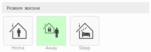 Lebensmodus (Lebensstil) - Jede Regel kann einem Modus zugeordnet werden. Sie wird dann nur ausgeführt, wenn sich das System in diesem Modus befindet. Die Modi im BeNext-System sind festgelegt: Heim, Auswärts, Schlaf. Der aktuelle Modus wird vom Benutzer selbst umgeschaltet. Wenn Sie beispielsweise das Haus verlassen, können Sie den Abwesenheitsmodus aktivieren und vor dem Schlafengehen den Schlafmodus aktivieren.