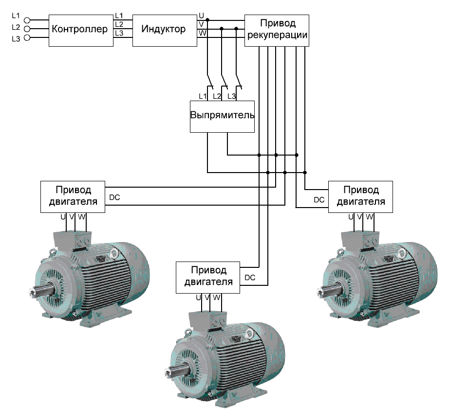 Um den Anlaufstrom in Systemen mit mehreren Motoren zu begrenzen, werden bei Kombination der DC-Busse Thyristormodule verwendet, die über Schütze mit den DC-geladenen Kondensatoren des Wandlers verbunden sind. Nach dem Laden der Kondensatoren wird das Thyristormodul ausgeschaltet. Offensichtlich sind Wiederherstellungssysteme unterschiedlich konfiguriert und werden individuell entworfen.