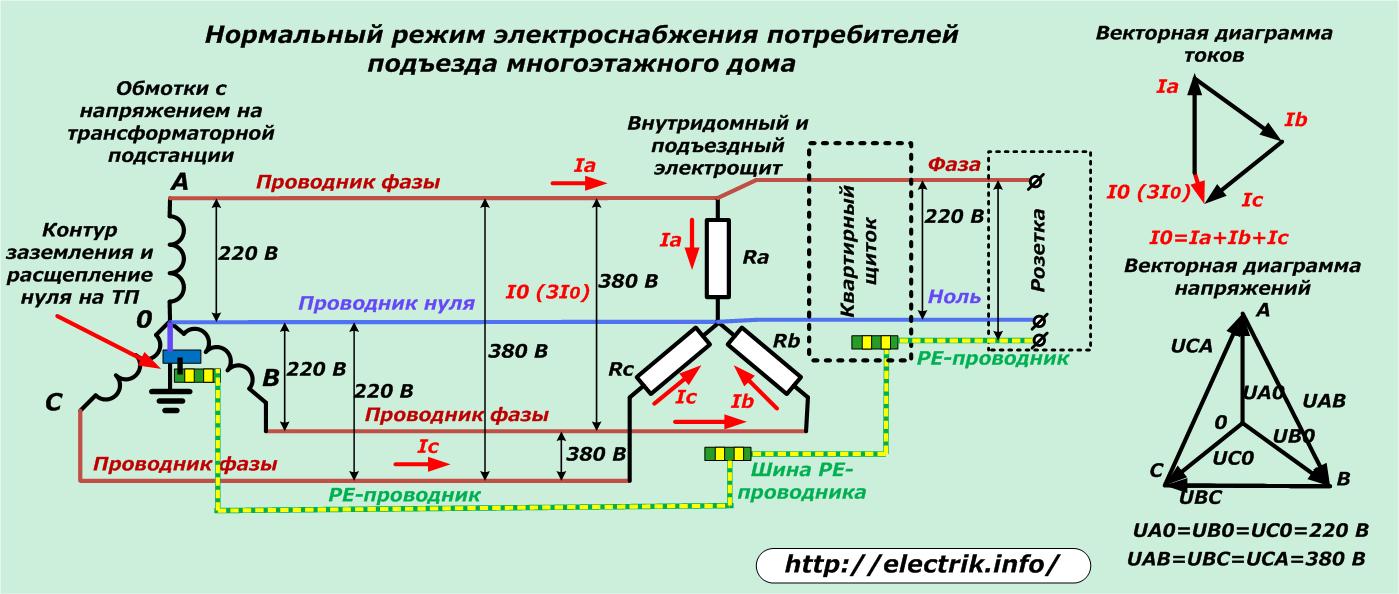 Phasen und Nullen von der Ausgangswicklung des TP über Luftdrähte oder Erdkabel werden der Eingangsabschirmung eines mehrstöckigen Gebäudes zugeführt und bilden ein dreiphasiges Spannungssystem mit 380/220 Volt. Sie lässt sich auf den Laufwerksschildern scheiden. In der Wohnung gibt es eine einphasige Spannung von 220 Volt (die Drähte „A“ und „O“ sind im Bild hervorgehoben) und den Schutzleiter PE.