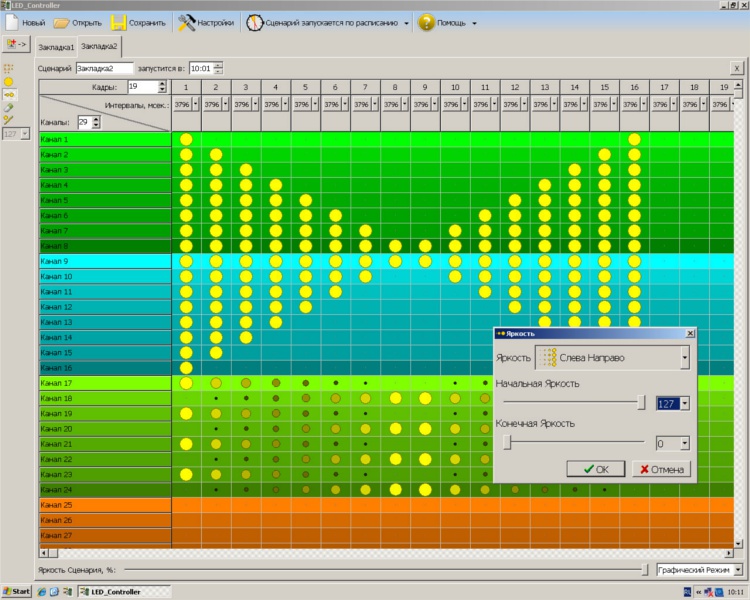Das Fenster des Programms "LED-Controller" zum Flashen des Skripts wird in Form einer Matrix von Zellen mit Linealen angezeigt: der Name des Kanals vertikal und die Betriebszeit - horizontal, die der Benutzer ausfüllt, die Ein- und Ausschaltmodi für jede Komponente oder Gruppe einstellt, Effekte hinzufügt und die Arbeitszeitintervalle anpasst mit einem praktischen Schieberegler.